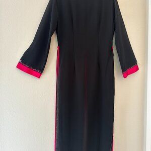 DETAILS – Lovely Asian Tunic Dress, black with hot pink details and embroidered flowers, with side slits. Condition: Good (pre-owned). 100% Polyester, made in Vietnam, Pit-to-Pit: 19.5””, Waist: 16”, Length: 49.5” (marked as Large, but measurements seem small!)
