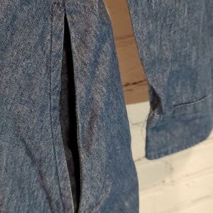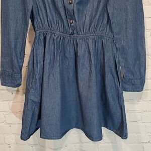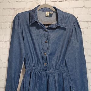 In very good used condition no flaws. Dark chambray denim with elastic in the waist. Long sleeves, pockets, and a button front. Measures 32.5 inches long.