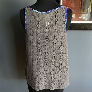 Mimi Chica blue/violet tones floral front, gray lace back tank. 100% rayon. Medium. Excellent condition. Nonsmoking home.