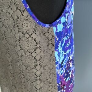 Mimi Chica blue/violet tones floral front, gray lace back tank. Medium.