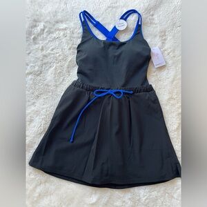 Cute black and royal blue swimsuit with skort, great for water parks or beach volleyball too!