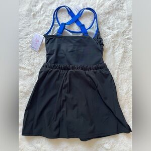 Cute black and royal blue swimsuit with skort, great for water parks or beach volleyball too!