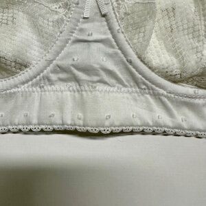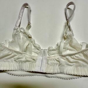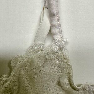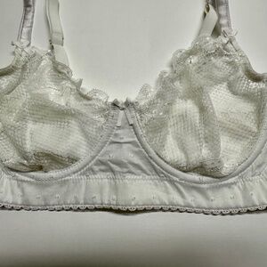 Beautiful new Mimi Holliday white/cream delicate lace and polka dot bra (never worn but tags removed). Cute bows on straps and two row hook and eye on back.