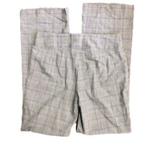 tay stylish and comfortable throughout your pregnancy with these Mimi Maternity wide-leg trousers in size medium. Featuring a soft elastic waistband in the front for a secure fit, these trousers are designed for easy pull-on wear. The gray/purple checkered pattern adds a modern touch, making them a versatile addition to your maternity wardrobe. Perfect for casual outings or more dressy occasions, these trousers offer a combination of comfort, flexibility, and chic style.