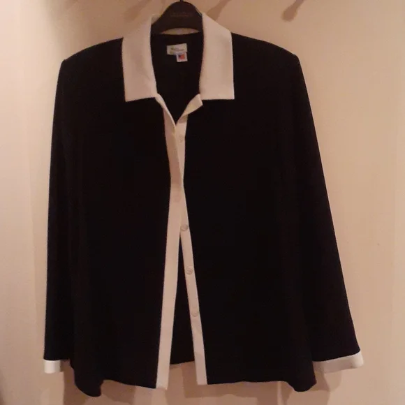 Size large. Black button down lined jacket with white trim on collar, button trim, and sleeves. Excellent condition. Polyester/triacetate material.