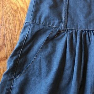Super cute denim look with a wood look button, and pockets.