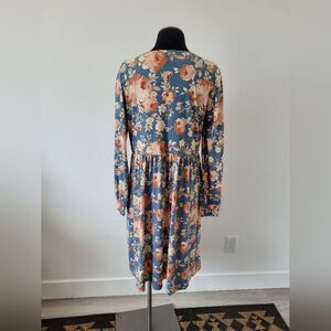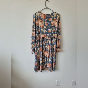 Very cute dress in a blue and pink floral print. Long sleeves with puffed cuffs and two side pockets. Round neckline. Lightweight Breezy material. Excellent condition. Size large measures approximately 40 inches long 19.5 inches underarm to underarm laid flat 18 inches laid flat across the waist.