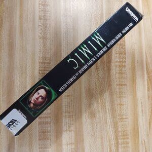 The product is a VHS tape of the 1997 film "Mimic" directed by Guillermo del Toro, featuring Mira Sorvino, Jeremy Northam, and Normen Reedus. This sci-fi horror movie follows the story of a replicant insect that mimics a human. The VHS tape is in NTSC signal standard, with a rating of R and special features that include being a cult favorite. The film is in English and produced by Dimension Home Video.