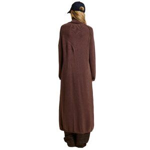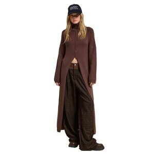A split-second statement in sculpted knit. This long, cocoa-toned sweater plays with contrast: its high collar speaks of restraint, while the dramatic front slit slices through expectation. Draping fluidly over form, it reveals and conceals in rhythm—soft texture meeting bold intention. It’s part armor, part invitation, made for those who command presence by simply existing.