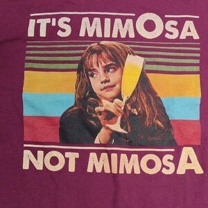 Mimosa women's burgundy t shirt with no size and no fabric content. The bottom of the t shirt does not have a seam