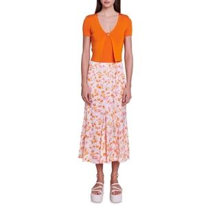 Cardigan: collarless, clover clip closure at front, short sleeves, rib-knit