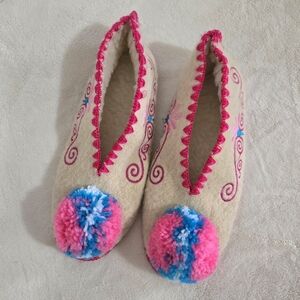 In like-new condition. Handmade in Greece. The outer layer is made of wool while the bottom is of a slip-resistant leather. Cream, pink, and blue are the main colors. They have a fun fuzzy ball on the toes. These can be worn as slippers, moccasins, or even part of a clown outfit. So much fun!!!