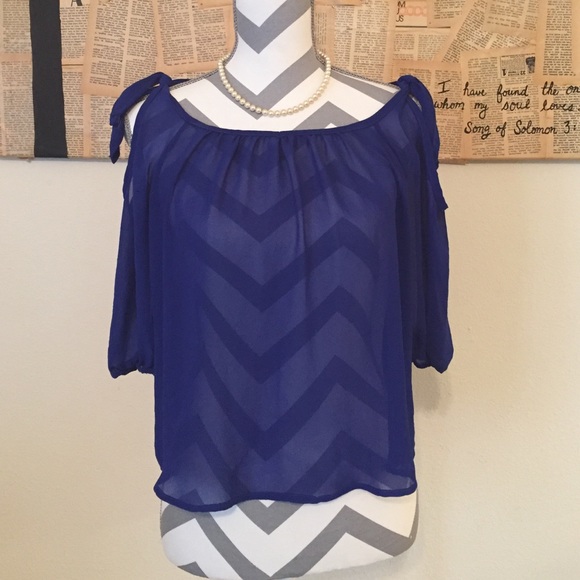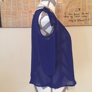 Sheer royal blue blouse with shoulder cut out sleeves.