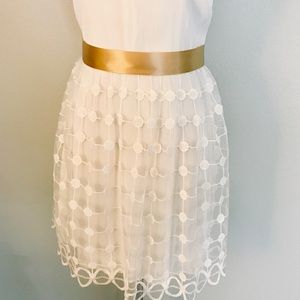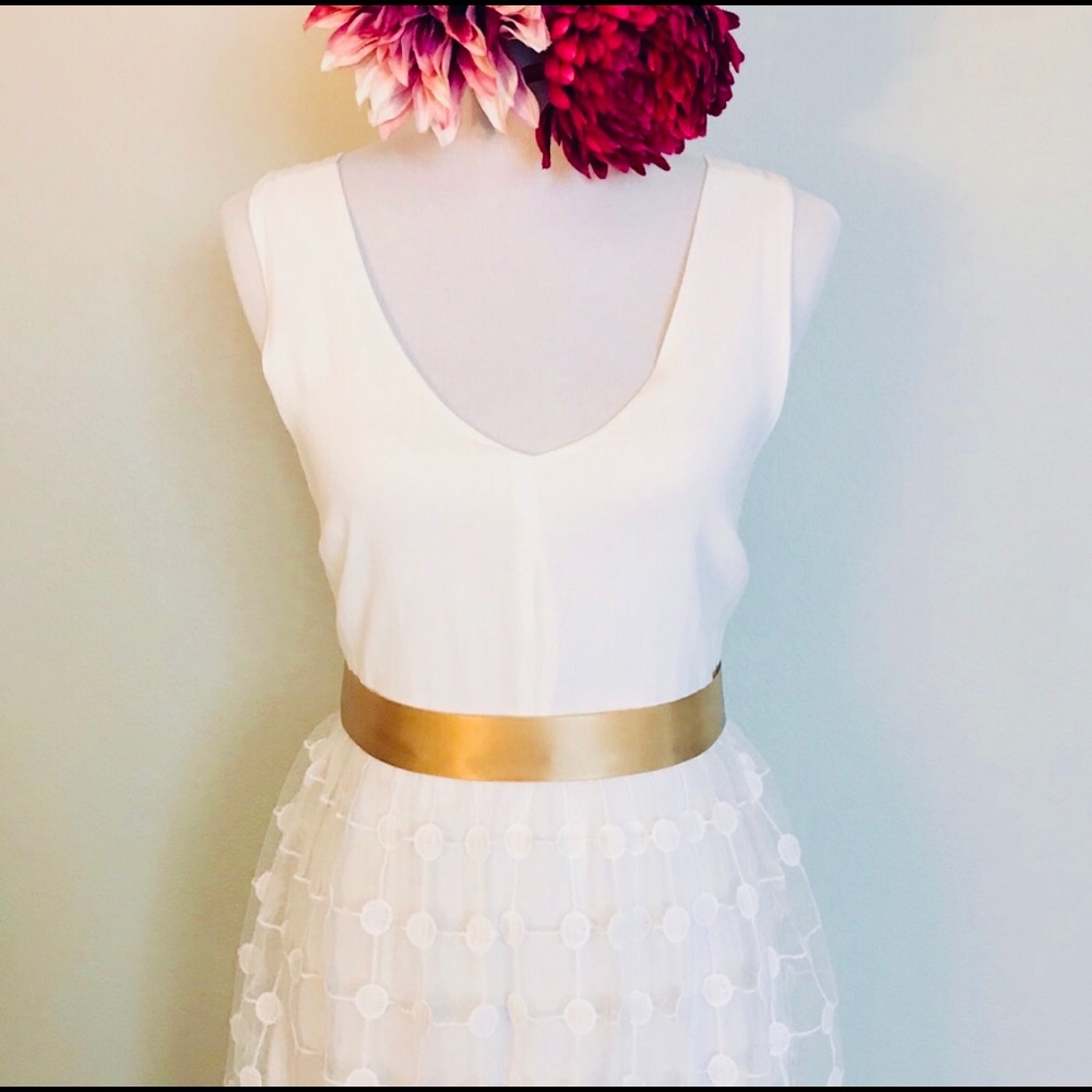 Mind Code dress. Crepe silk like deep v bodice and skirt with mesh lace overlay. Scalloped detail hem. Back zip. Approximate measurements from flat lay, unstretched: bust 16”, waist 13.5”, length 34”. Fabric allows about one half inch stretch. Excellent preowned condition. RN 120064 Style KD7208