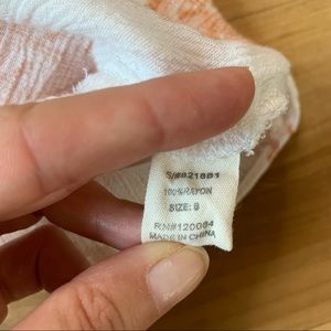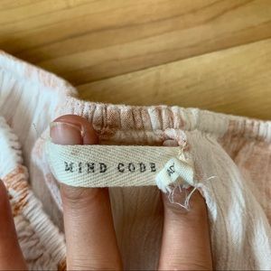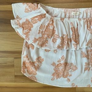 A cute off-the-shoulder top by Mind Code! Cream colored with a light coral floral print. Single ruffle across the front and back. Lightweight and textured. Made of rayon. Machine washable. Pre-loved and in excellent condition with no flaws.