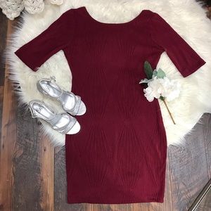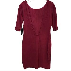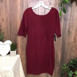 New Low cut back, maroon with geometric designed that shines. Half sleeves. Body snug and stretchy. Falls above the knees. Runs small