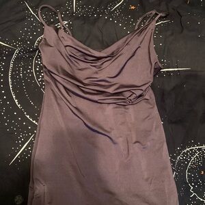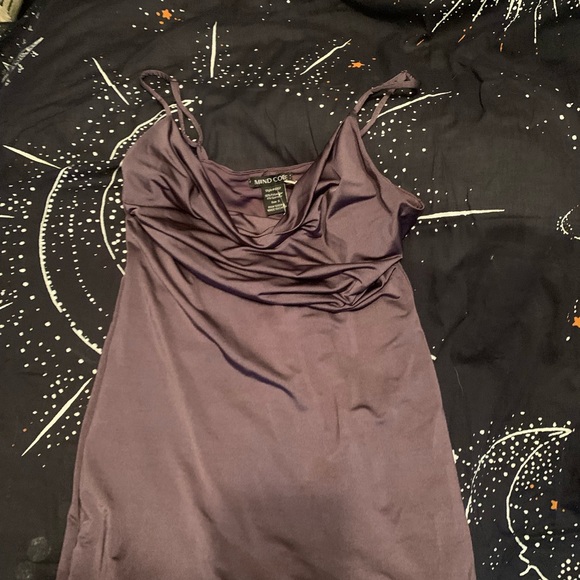 Elegant purple mini dress. Features a draped neckline. Perfect for a night out.