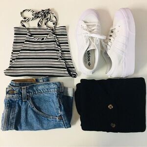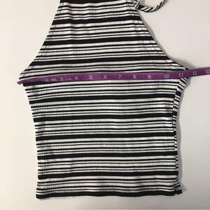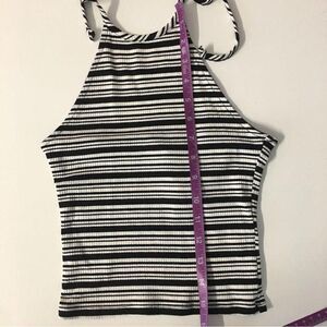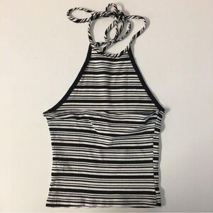 Black & white striped ribbed halter semi-cropped top. It’s pretty lightweight. Great for the summer with some high waisted denim shorts or mom jeans and platform sneakers. New with tags. Never been worn. Feel free to ask questions or make an offer!