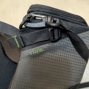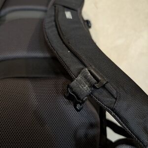 Durable black men's backpack with padded back panel for comfort. Adjustable waist and shoulder straps provide secure, customized fit. Multiple attachment points and mesh padding for breathability. Sleek black styling for everyday use.