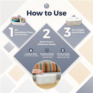 🧿🔒 HOW TO USE IT – Out of Sight ~ Out of Mind. Set countdown timer and select Commitment Level. 3 unique modes allow users to select ‘Commitment Level’ ranging from simple lockbox (no timed countdown), Standard Mode (Timed Countdown w/ unlock code) & Patent Pending Fortress Mode (Timed Countdown w/ NO unlock code). Timer can be set from 1 minute up to 30 days. (Fortress Mode Override Code can be provided in emergency by emailing customer support)