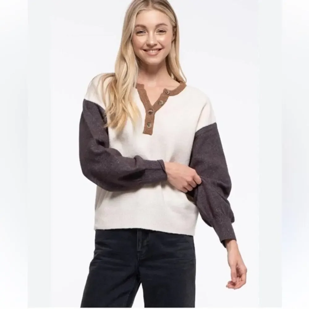 Stay warm and chic with this Mine Sweater. Perfect for cozy nights in, this sweater is the ideal mix of comfy and stylish. Look great, but feel even better! This sweater features a round neckline with a functional four button closure in the front, long sleeves with tapered cuffs, and a neutral colorblock pattern. • Acrylic, Polyester, Spandex • Hand Wash Cold • Imported
