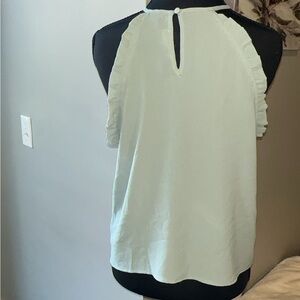 Chic light blue tank with ruffle accents. Features a stylish front tie. Perfect for casual outings.