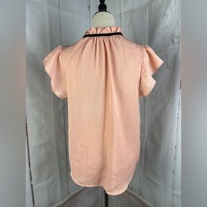 This beautiful pink blouse features a black bow and is designed for women of size L. The blouse has short sleeves and a turtleneck neckline with a lace-up closure. It is made of lightweight material and has accents of a delightful bow. The blouse is pre-owned but is in excellent condition.