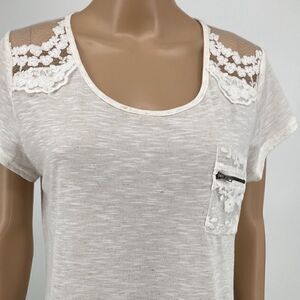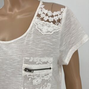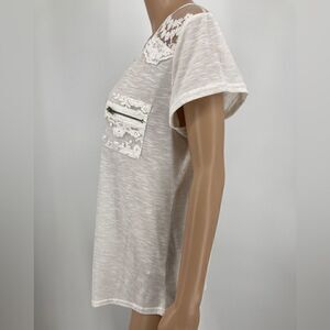 Mine Women’s White Lace Top with Pocket Size XL Approximately Measurement: Shoulder 16”/Pit 20,5”/Shoulder to Hem:Front 25”-Back 28” Pre-owned Gently Used Great Condition