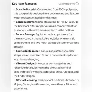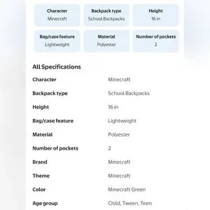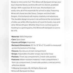 The Minecraft Backpack is a stylish and durable accessory for kids, featuring a green color and the iconic Minecraft brand. Made from 100% polyester, this backpack is perfect for both boys and girls who love the popular game. It offers ample space for storing school supplies or gear while on an adventure, making it a practical and fun addition to any Minecraft fan's wardrobe.
