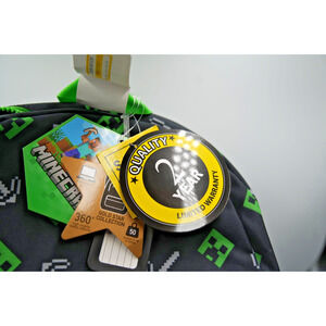 • Minecraft backpack with padded straps, Creeper/pickaxe print, and name tag