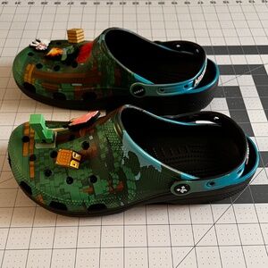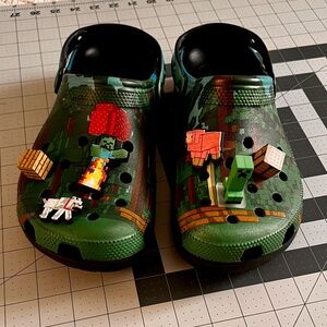 Fun Minecraft Crocs with jitbits. I still have the tags, because my son outgrew them after just a couple weeks so light wear. The zombie jitbit lights up/blinks when you walk.