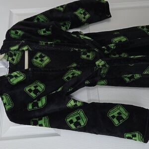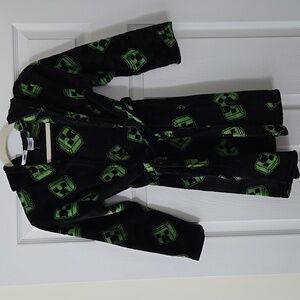 Cozy black robe with green pattern. Features a hood and belt tie.