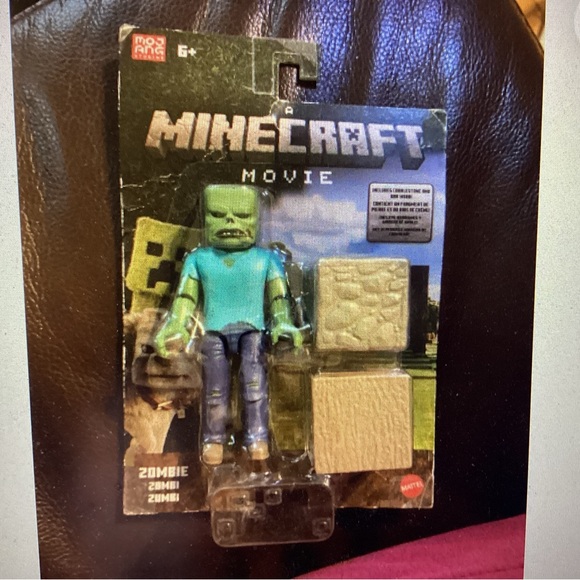 Minecraft Zombie action figure with accessories. Features a green zombie with a blue shirt and dark pants.