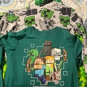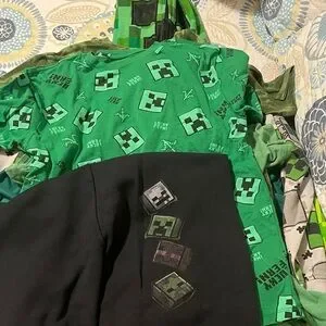 Minecraft bundle- 2 hoodies with full zip costume face, 1 sweat shirt, 3 short sleeve shirts, 1 long sleeve, 1 pair of joggers, 1 button up. Good condition normal wash wear no stains or tears. Son is not into Minecraft anymore 😔 This vibrant green pixelated kids matching set is perfect for playful adventures. The set features a fun design that kids will love.