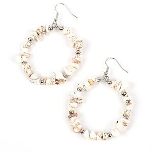 Infused with dainty silver beaded accents, pieces of white stone are threaded along a wire hoop for an artisan inspired vibe. Earring attaches to a standard fishhook fitting.