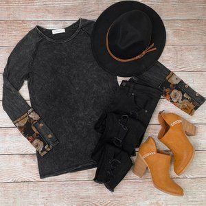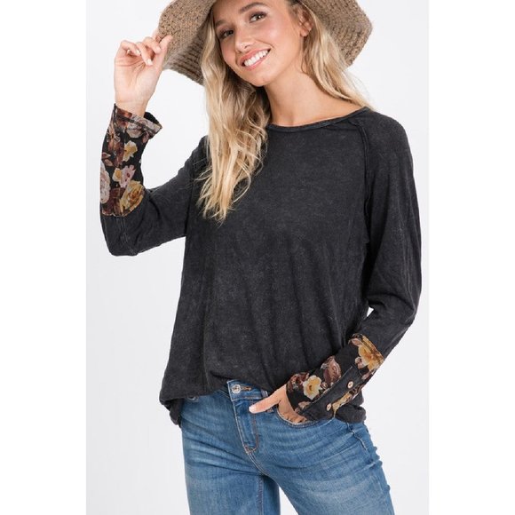 This tee is so adorable! It features charcoal/black mineral washed fabric, with floral contrast & wood button detail at the sleeves.