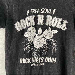 • features: This rock n roll graphic tee features a trendy mineral wash finish and an authentic, worn-in feel. The "Free Soul Rock n Roll Vibes" graphic with artistic roses perfectly captures an indie grunge aesthetic. With roll-style short sleeves and a comfortable 100% cotton construction, this shirt is a staple for streetwear style. Approx 18” pit to pit 25” length.