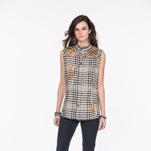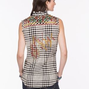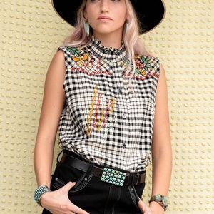 Beautiful New Double D Ranchwear Miner's Daughters Sleeveless Top. It's on a Gingham black and white print full of embroidery over the front and back, sleeves are rough cut with a button down front. Brand New never worn