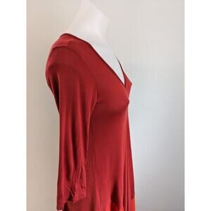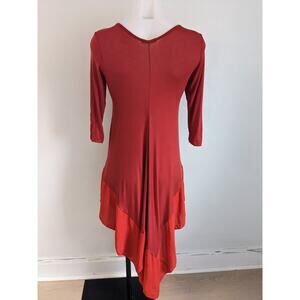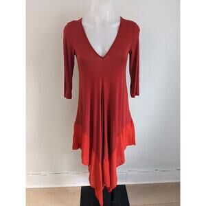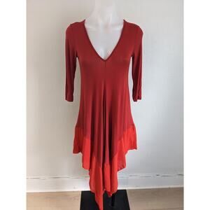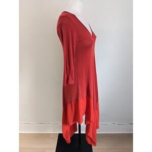 Ming Ming Size Medium Jersey Shift Dress Red Orange Colorblock V-Neck Handkerchief Hem 3/4 Sleeves Stretch