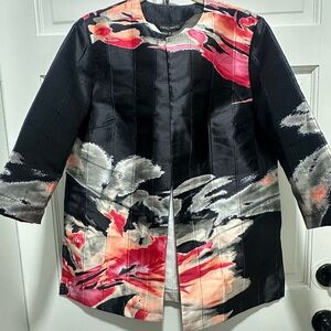 Ming Wang Abstract Floral Watercolor Jacket Black Pink Red Open Front Size M