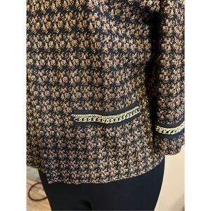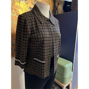 This is a beautiful unsophisticated cropped jacket from Ming Wang. It has a herringbone pattern in brown and black with gold thread. There is chain trim, and the front is open with one hook and eye closure at the top. It has lightly padded shoulders. This will look great with your Acrylic knit black pants.