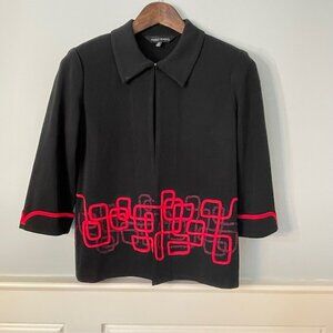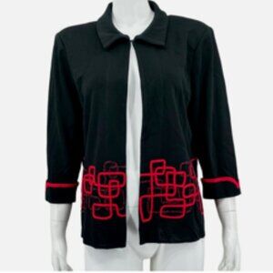 Black/Red Caridgan Sweater Jacket with collar, Single hook closure at neckline, embellished abstract design. 3/4 length cuffed sleeves, small shoulder pads. Easy care, wrinkle resistant, great for travel. Elegant and classic sweater jacket.