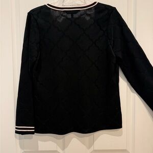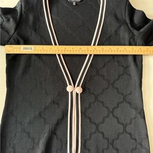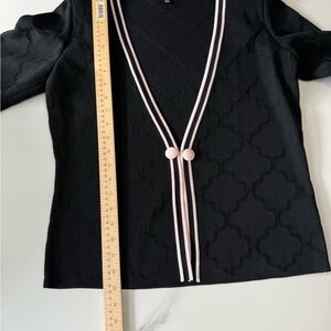 Beautiful Ming, Wang, cardigan sweater, and blue and pink. This is the dark blue, in the pictures it looks black. Size small.