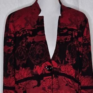 Ming Wang Deep Red & Black Rose Explosion Stand Up Notch Collar Knit Sweater