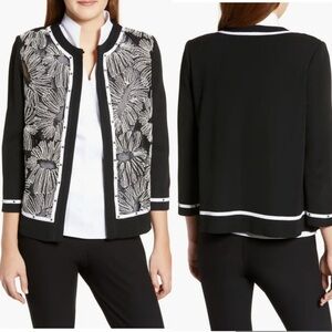 Ming Wang Floral Embroidered Knit Jacket Black and White