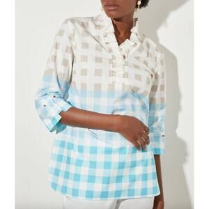 Ming Wang Gingham Ruffle Collar Top Blouse Relaxed Cotton Blue Popover XXS NWT.