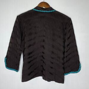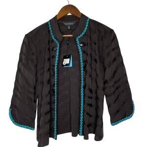 Ming Wang Jacket L Brown Blue Trim Open Front Textured Knit Career Chic NEW