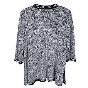 Cardigan, Ming Wang, black white, open front, women's fashion, acrylic, geometric pattern, mid-length sleeves, decorative trim, 1X size, artsy topper, mature, office, occasion, lightweight