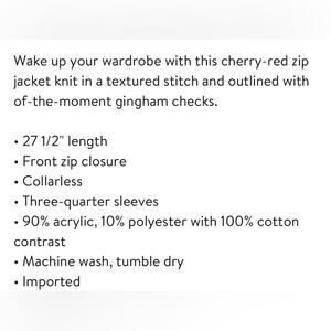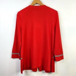 Ming Wang Poppy Red Gingham Trim Zip Front Long Sweater Jacket Womens S new nwt