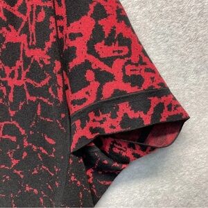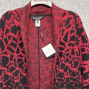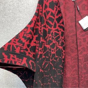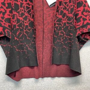 Chic poncho with bold red and black pattern. Open front design. Perfect for layering. This elegant Ming Wang cardigan sweater features a striking red and black knit design in a versatile poncho style. With short sleeves and a comfortable fit, it's perfect for layering and adding a touch of sophistication to any outfit. • Short sleeve poncho style • Red and black knit design • Comfortable fit for layering • Versatile and stylish New with tags